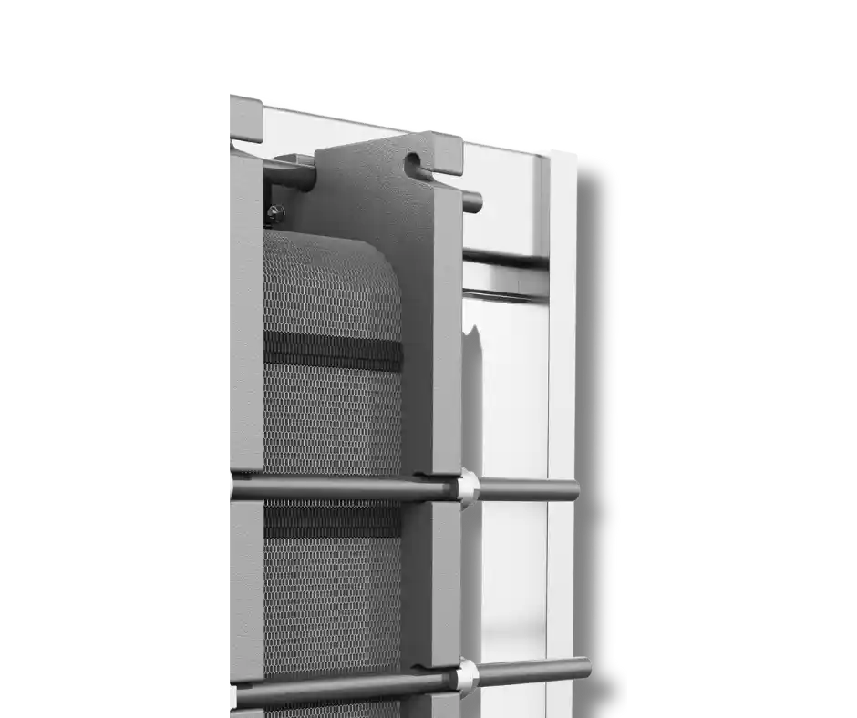 Stabilní a rozebíratelný rám výměníku umožňuje rychlý přístup k deskám, snadnou údržbu i přestavbu podle provozních potřeb.